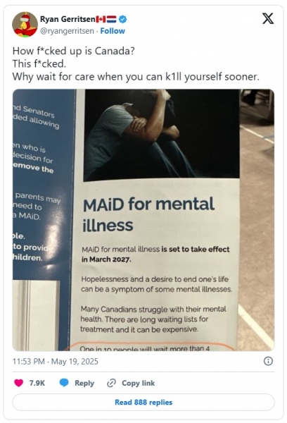 Canada’s Medical Assistance in Dying (MAiD) program is set to expand in 2027 to include people whose only underlying condition is “mental illness.”