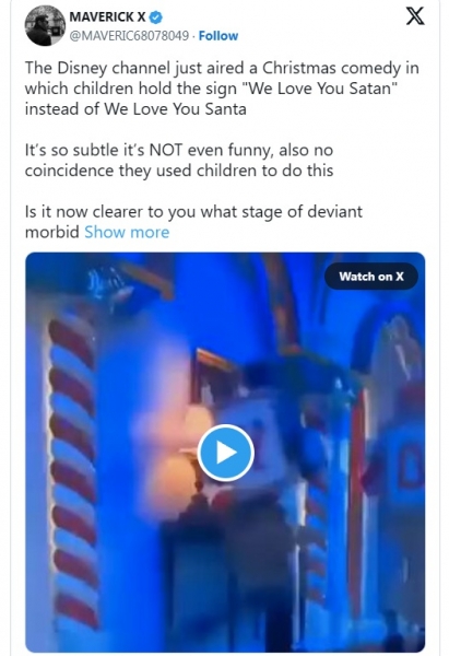 The Disney channel just aired a Christmas comedy in which children hold the sign "We Love You Satan" instead of We Love You Santa
