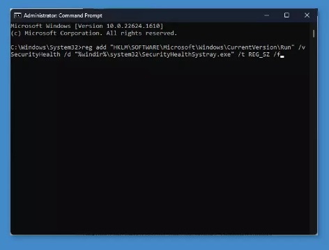reg add “HKLMSOFTWAREMicrosoftWindowsCurrentVersionRun” /v SecurityHealth /d “%windir%system32SecurityHealthSystray.exe” /t REG_SZ /f- Wait for the process to complete.