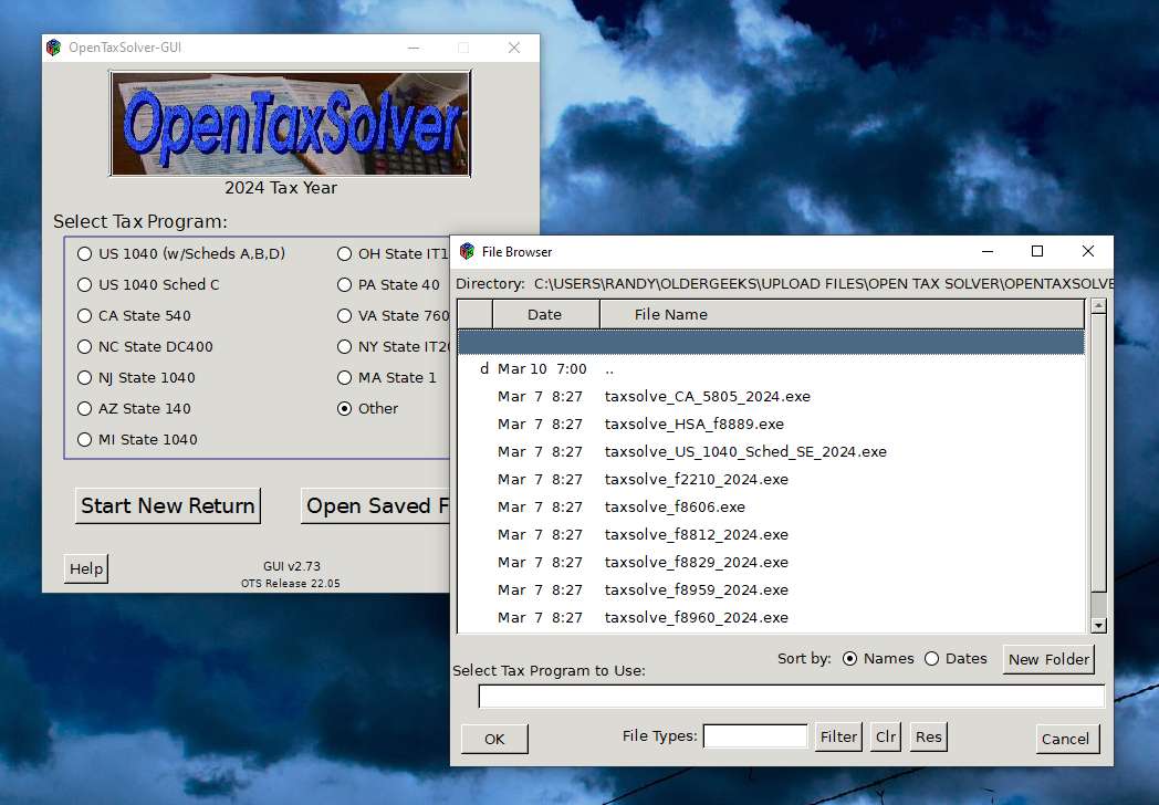 OTS has been updated for the most recent 2024 tax-year. As in prior years, the OTS package covers popular Federal IRS forms and 10 of the largest states that impose income taxes. These are the Federal-1040, Schedules 1-3 along with Schedules A-D, and the states of VA, NC, OH, NJ, MA, PA, CA, AZ, MI, and NY. The package also includes form programs for the Health Savings Account (HSA) Form 8889 and Form 8606 for Nondeductible IRAs, and Schedule-SE - all accessed under the Other Forms bullet of the OTS GUI front screen. Several additional forms have been contributed under the Other Forms bullet, including: Forms 2210, 8959, 8960, and California Form 5805. This marks the 22nd consecutive year that OTS has provided tax programs.