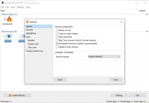 Simplewall presents a very easy and effective way to configure your Windows Filtering Platform and decide which applications and services get to run on your computer at launch and which ones you want to block.