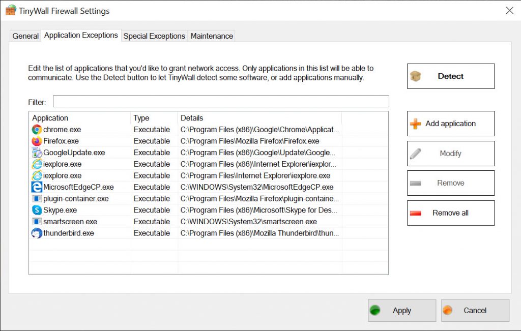 The interface is relatively straightforward to understand. TinyWall allows you to select the kind of connections that occur on your device. It blocks any connection from the start. It means you have to choose which connections are allowed through.