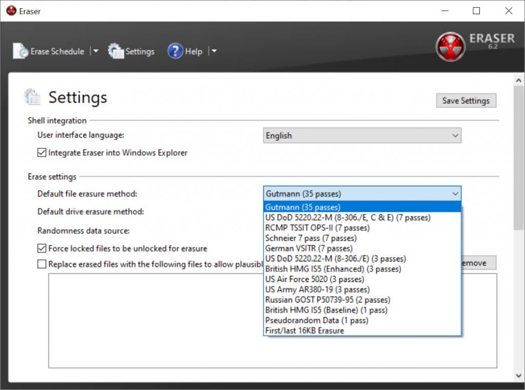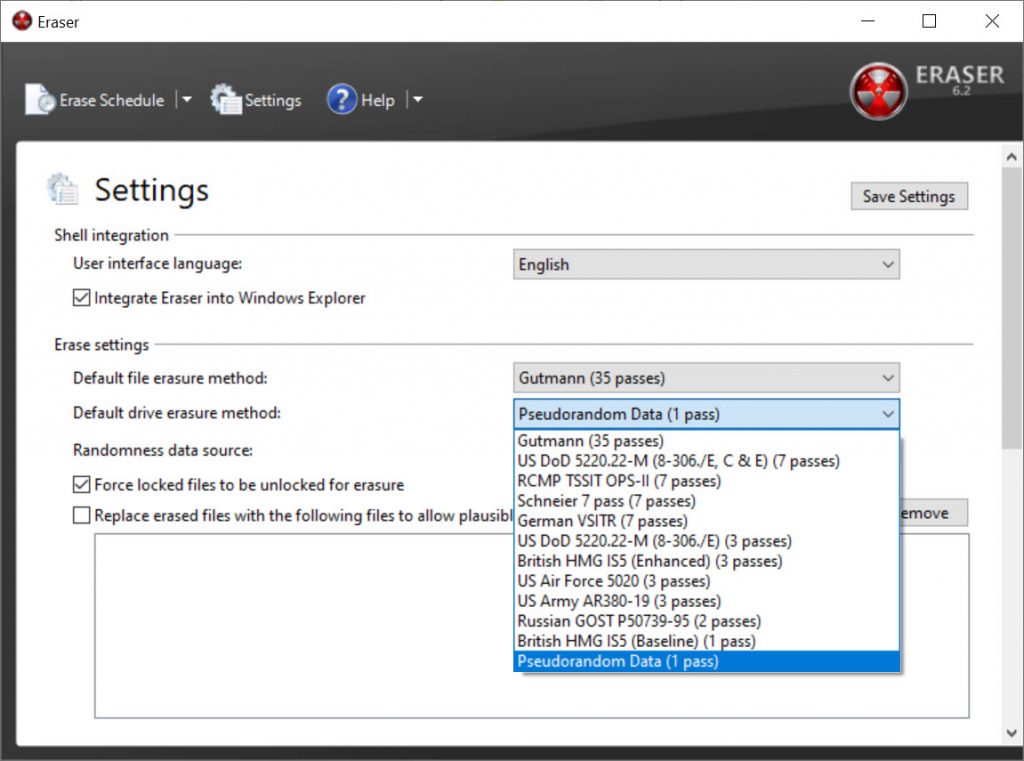 There’s nothing worse than an app that locks you into one way to do things. Eraser has many options. It is good because the application’s method of erasing your files is the most important.