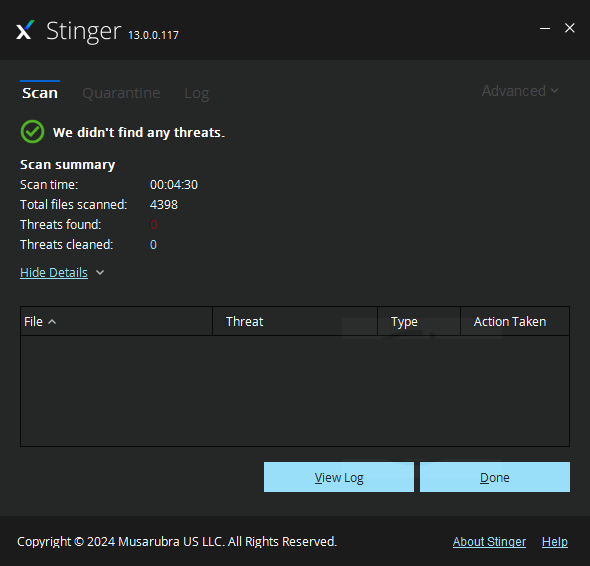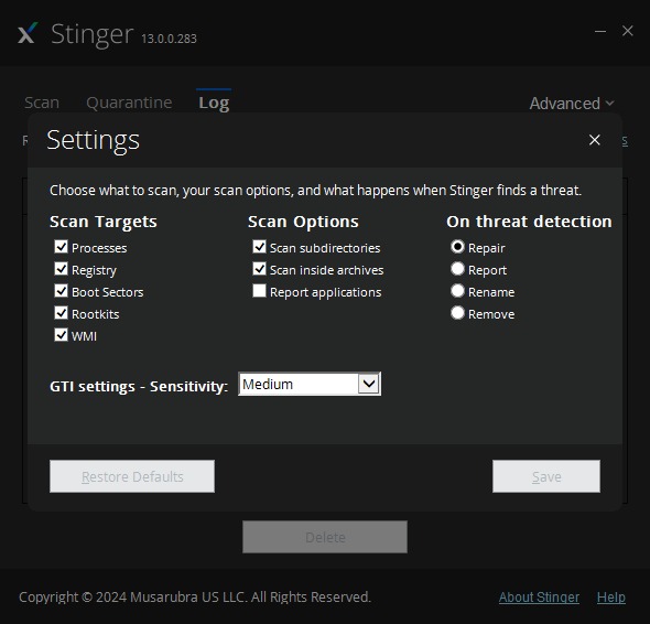 | Stinger may provide help, getting rid of specific malware. And the specific malware threats are listed. But beware. Setting the "GTI" sensitivity to high or very high will lead to a lot of false positives (malware you won't see on the threat list). If you set the sensitivity to high or very high, MAKE SURE stinger is set to "report" (not "remove" or "repair" . Being a novice, I reloaded my OS on the first false positive. After a series of false positives, I decided to do a little research on how the program works and no longer use highvery high sensitivity scans. |