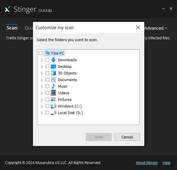 The Trellix Stingerr interface is plain and straightforward, simply select the drive or folders to scan and click a button. You can choose an action to perform if a virus is detected (delete, prompt, quarantine or rename) and also configure which type of files to scan.