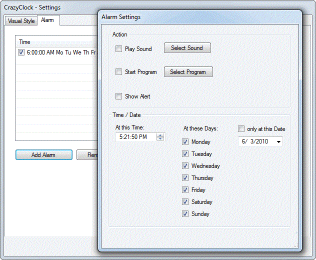 The program also includes a simple alarm features that allows you to configure recurring alarms that can launch a WAV sound file or program. Standalone software, no installation required.