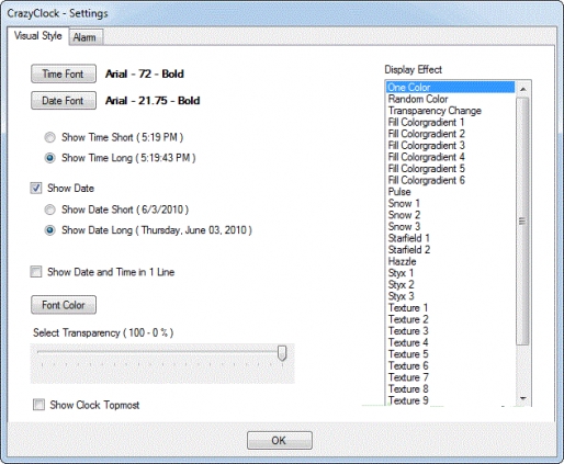 CrazyClock is customizable clock that displays the current time and date on your desktop. You can select the font type and size or choose one of several effect presets (color fades, snow etc.).