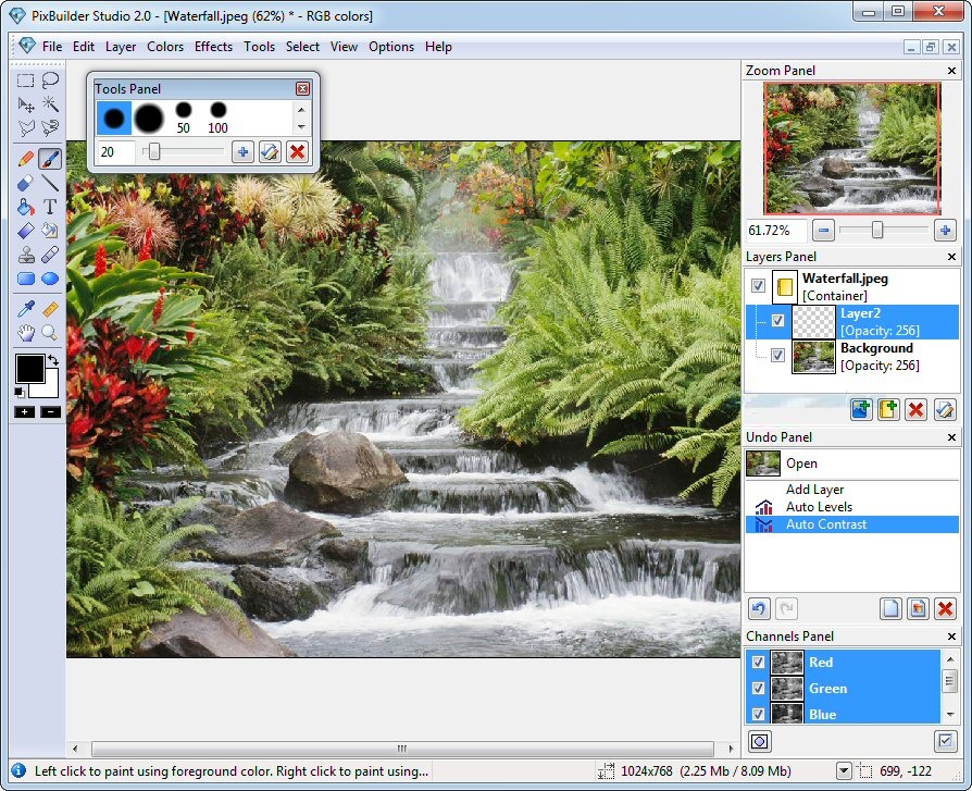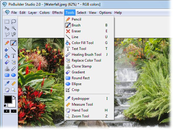 PixBuilder Studio also comes with a full range of drawing tools (brush, pen, pain fill etc.), as well as transparency masks, magic wand, lasso tools, gradient color transition effect, a healing brush for touch-up work, built-in shapes, image effects, multi-step Undo and much more.PixBuilder Studio used to be shareware but is now free.