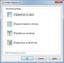 The first tweak is the option to display column header in all Explorer views. Normally, when you are viewing files as icons or thumbnails, you lose the ability to sort them by date, size or other file properties. Folder Options X eliminates that problem by adding the column headers to all views.