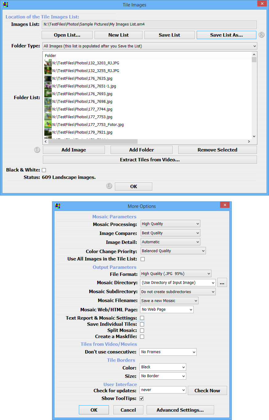 You can specify one or more folders as the source for the image tiles and the program will scan them into a database from where they can be easily re-used for other projects. You can even extract frames from a video file and use them as the base of your mosaic.