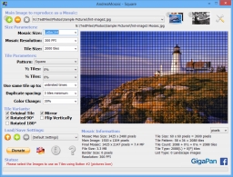 AndreaMosaic enables you to create a mosaic poster by using many small image tiles, that are analyzed and arranged to match the overall pattern of the original. You can specify the size of the tiles, the number of times each one can be repeated (if needed), tune color adjustments, and choose from a variety of mosaic patters.