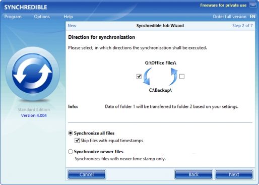 Synchredible is an easy-to-use tool for folder and file synchronization. It offers a wizard interface that lets you set up the synchronization jobs, select files to exclude, schedule the job for automated execution and more.