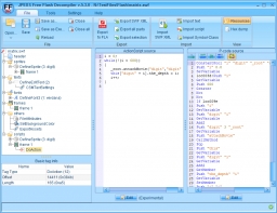 Other features include text search and replace, searching for SWF files in browser cache and application memory, Action 1/2 and AS3 support, hex dump view with color highlighting, editing via assembler source, and more.