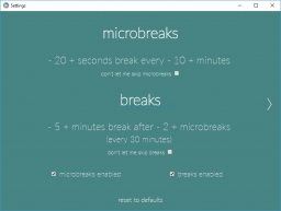 By default, the program runs in the system tray and brings up a reminder window and chime for a 20 seconds microbreak every 10 minutes and a 5 minute break every 30 minutes. You can customize the duration of the break as well as the time between microbreaks or skip them if you prefer.