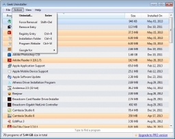 Geek Uninstaller is a software uninstaller that offers several advantages over the standard Windows software uninstall applet. It comes with a no-nonsense GUI that lets you view and sort all installed programs and provides right-click options to access registry keys, installation folder and web resources.