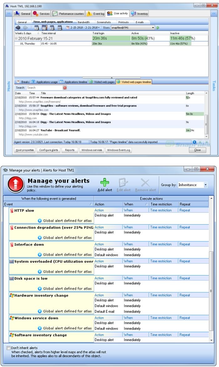 You can configure alerts that notify you when devices are down, monitor software and hardware changes, check which websites users have been visiting, what applications are being used, how much bandwidth is consumed and much more. The program also provides access to detailed system information for each machine, including performance counters, server performance reports, eventlog entries and more.
