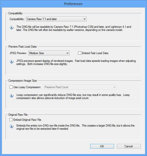 Other features include support for different Camera Raw versions, optional JPEG previews and compression settings.