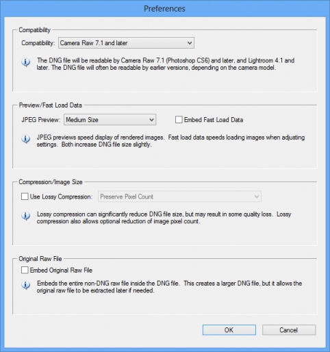 Adobe DNG Converter enables you to convert digital RAW file from various camera manufacturers to standard DNG format (Digital Negative), which is a public format that can be opened by Photoshop and many other image editing software.