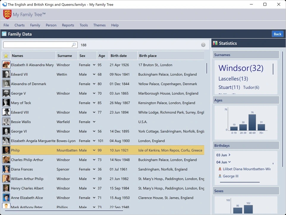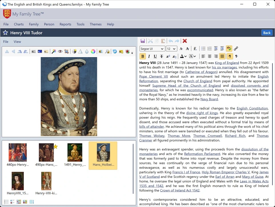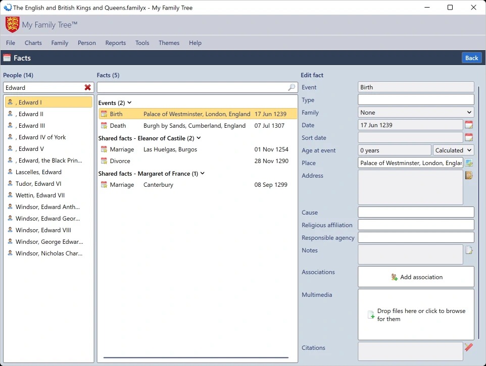 My Family Tree is a genealogy software to create your own family tree or import existing GEDCOM files for editing. It offers a modern interface that does not require you to be a historian in order to use it, and makes it easy to get started. The program offers support for genetic data, photos, videos and other attachments that can be added to document family members in detail. Browse the interactive tree display, view a photo slideshow of family members, review family events on a timeline display, analyze family statistics and more.