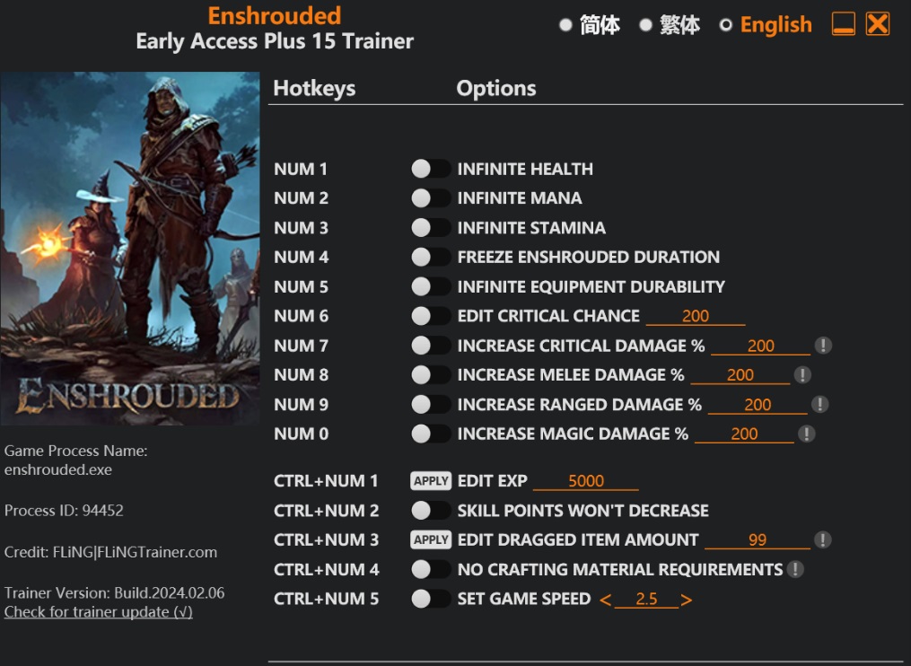 Num 1 – Infinite Health Num 2 – Infinite Mana Num 3 – Infinite Stamina Num 4 – Max Comfort Num 5 – Freeze Enshrouded Duration Num 6 – Infinite Equipment Durability Num 7 – Edit Critical Chance Num 8 – Increase Critical Damage % Num 9 – Increase Melee Damage % Num 0 – Increase Ranged Damage % Num . – Increase Magic Damage % Num + – Enemies Can’t Attack