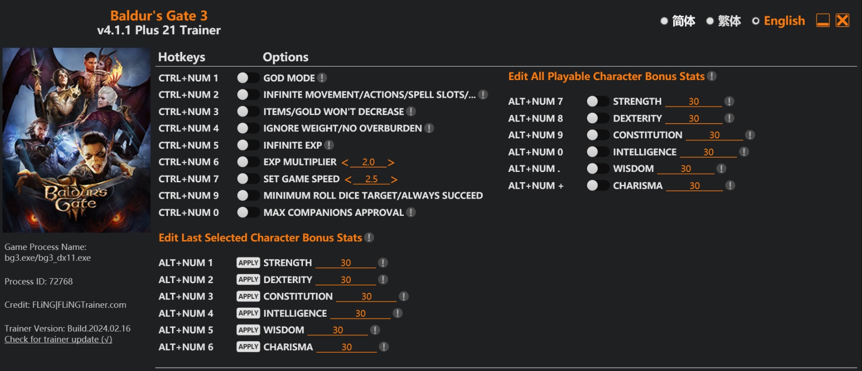 GAME TRAINER | Baldur's Gate 3 v4.1.1 Plus 21 Trainer Updated 2024.02.16 (trainer) ...