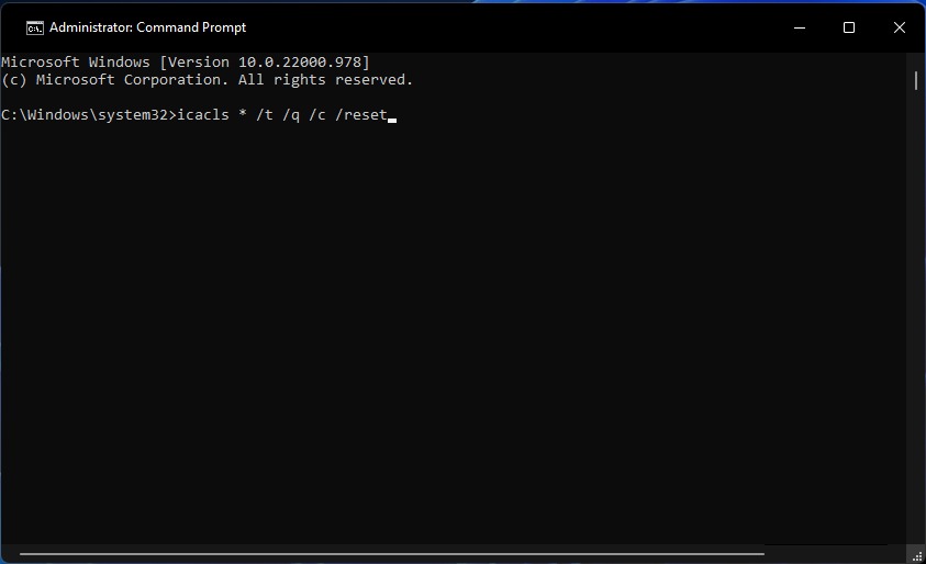 5. Alternatively, you can reset a folder tree’s permissions to default by including its directory path in the command.