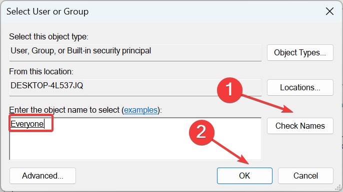 Enter Everyone in the text field, click on Check names, and then on OK on all windows to save the changes.