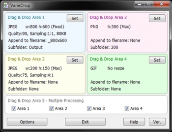VarieDrop is a unique image resizing tool that allows you to quickly resize images based on four different presets. Each preset is shown as a color coded drop area and you can simply drag'n drop ..