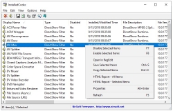 | InstalledCodec is a small utility that displays the list of all Codec drivers and DirectShow filters installed on your system and allows you to easily disable or enable any Codec/DirectShow component or export the list into text/xml/html file. For each component the following information is displayed:<br><br>Display Name, Type, Disabled Status, Installed/Modified Time, Description, Company Name, Filename, and more. You can easily select one or more components, and then disable or enable them, export the information into text/xml/html file, or copy the information to the clipboard, and then paste it to Excel or OpenOffice spreadsheet. Standalone software, no installation required.<br><br>Just copy the executable file to any folder you like, and run it.