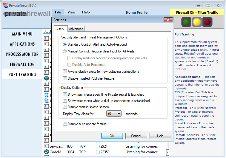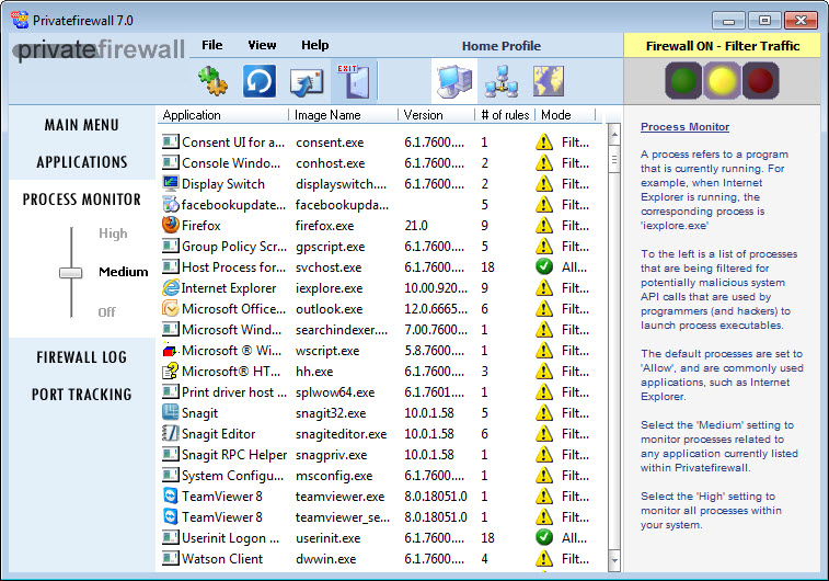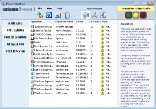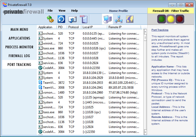 Privatefirewall may be considered a good anti-theft and anti-intrusion solution mainly because it is free and enlists sufficient security features. Moreover, this firewall integrates an application manager, port tracking, process monitoring, and filtering traffic.
