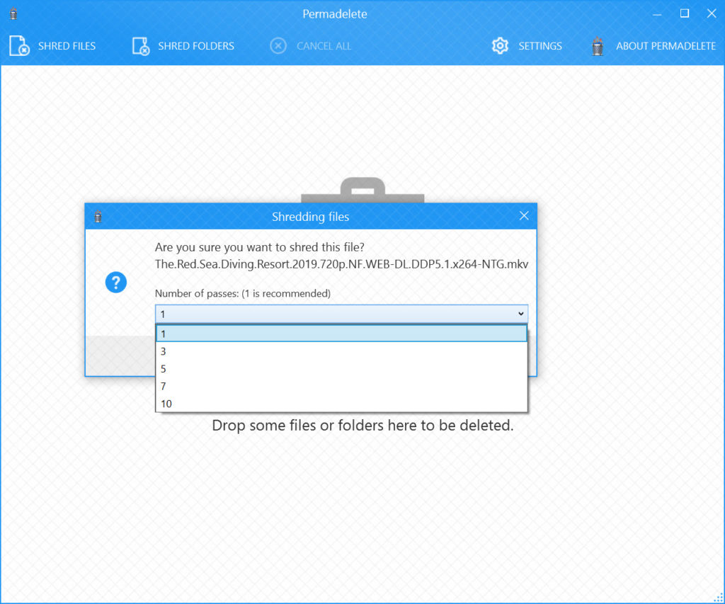 The interface of the application is simple and friendly. You must drag the file or directory into the application window and confirm the number of overwrite steps the application will perform to clear the data.