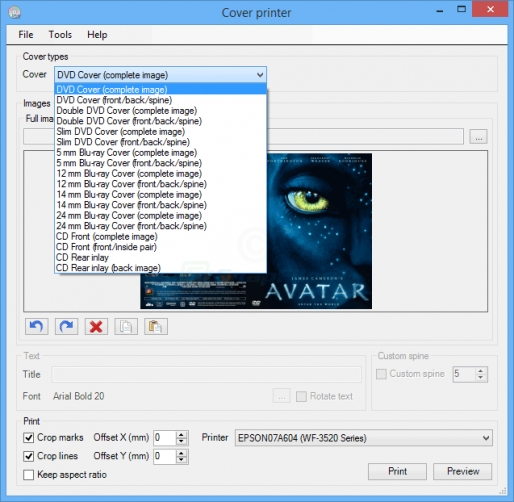 The program supports separate or combines front/back images and can also extract the front and back image from a full cover. Once you have loaded the cover image(s), you can rotate them if needed and also preview the cover before sending it to your printer.