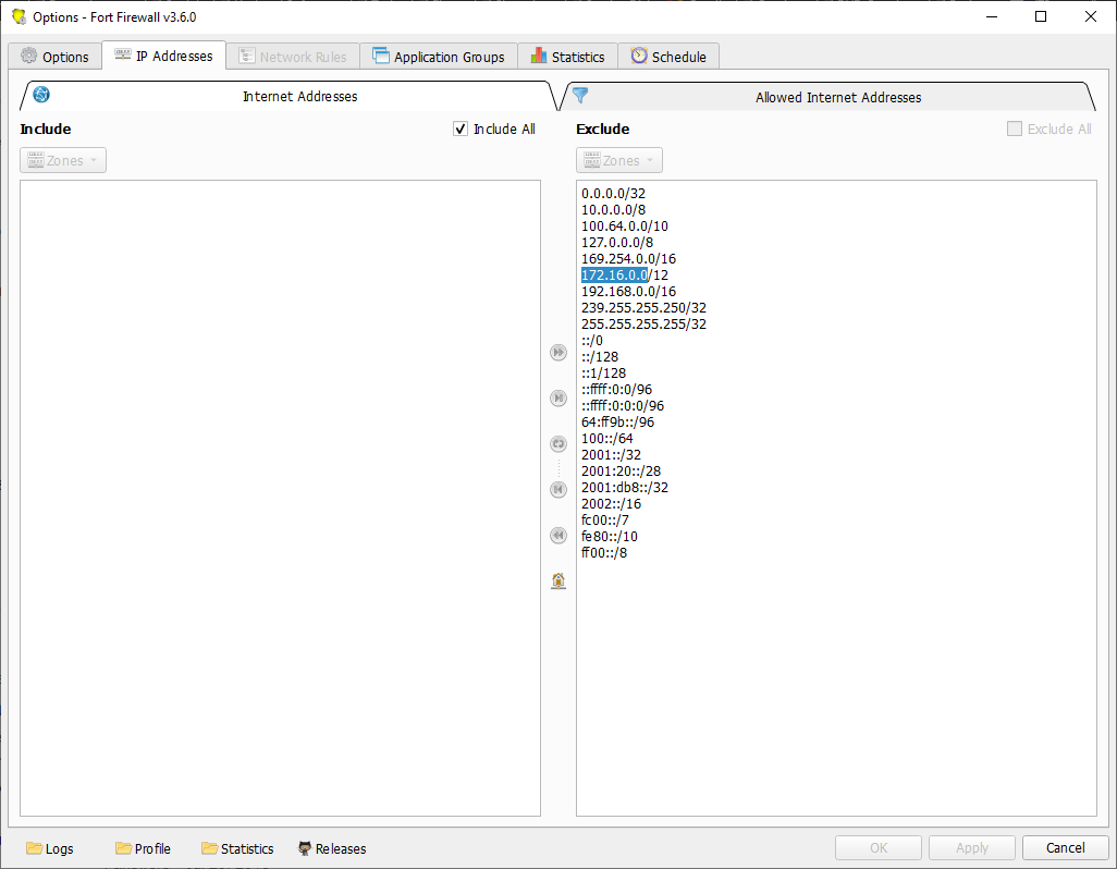 Fort Firewall is able to filter by SvcHost.exe service names and offers support for wildcards in app path names. Thanks to this feature, you can monitor the processes that access the network on your system. Once you have filtered traffic by network addresses, you will also be able to create groups to more effectively monitor the services accessing the Internet.