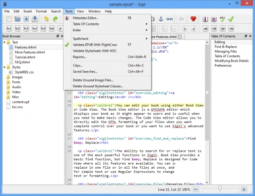 Other features include integrated spell checking, EPUB validation (FlightCrew), metadata editing, ebook content reports, a built-in clip manager, and more.