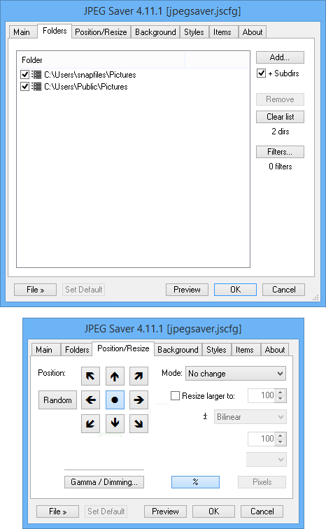 The program offers many configuration options that allow you to customize how your images are displayed and in which order they are shown. You can select multiple folder locations as source for the screensaver images and further control which images are shown by setting custom filters based on the file name, date and other criteria.