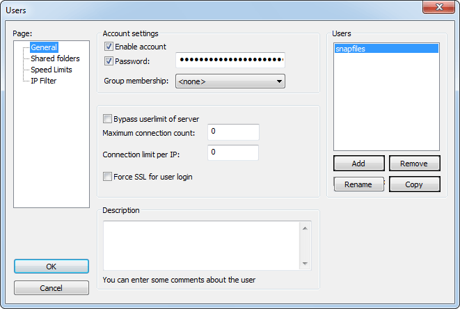 FTP server FileZilla Server is a full featured FTP server with support for secure SSL/TLS connections, IP security, anti-FXP options, per-user speed limits, user groups and MODE-Z compression. It provides a plain, but easy to use interface that can be installed as Windows service.