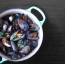 Školjke temeljito očistite, odprte in poškodovane zavrzite. Por očistite in narežite na kolesca, česen olupite in strite oz. sesekljajte. V večji posodi oz. loncu pri srednji temperaturi segrejte olje ...