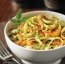 Korenje ostrgamo in vzdolžno nastrgamo na zelo tanke rezine. česen in ostrgan ingver drobno nasekljamo. V oplasteni ponvi popražimo sezam. Rezance skuhamo v kropu. Na olju in maslu dve minuti pražimo česen in ingver. Dodamo korenje in pražimo p ...