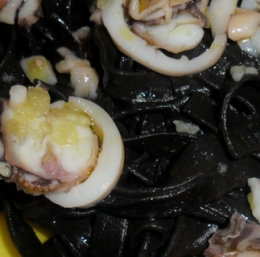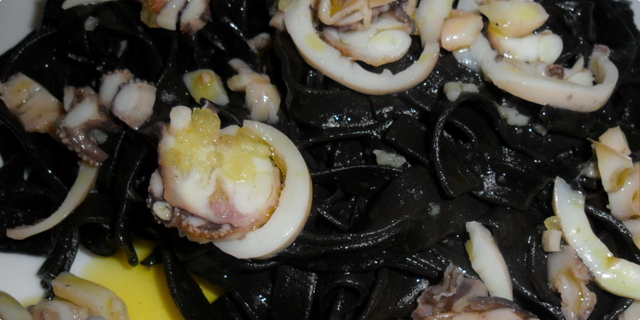 Dodamo še drobno narezane stroke česna in pražimo, da čebula postekleni, česen pa medtem ne sme porjaveti. Dodamo narezano sipo in med mešanjem sotiramo pet minut. Prilijemo vino, premežamo in počasi kuhamo 15 minut. Po okusu solimo in popramo, po želji lahko dodamo tudi zdrobljen čili. Nato previdno predremo vrečke s črnilom, ki ga vlijemo v ponev, urno premežamo in takoj odstavimo z ognja, da ne začnejo nastajati grudice. Če bo omaka postala povsem črna, ne skrbite, takšna tudi mora biti. Medtem špagete oziroma bigole po navodilu na embalaži skuhamo na zob. Odcedimo jih, dodamo v ponev s črno omako, potresemo s sesekljanim peteršiljem, dobro premešamo in takoj postrežemo. Poleg seveda ponudimo dobro ohlajeno vino, kakršnega smo uporabili za kuhanje.