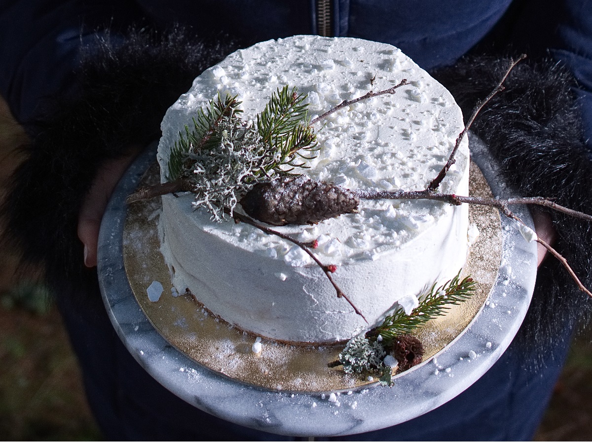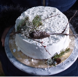 Tortogradnja je osnovna: biskvit položimo v tortni obroč z acetatno folijo. Premašemo ga s tretjino kreme. Postopek še dvakrat ponovimo. Za zasnežen tortni videz moramo le stepsti sladko smetano in z njo enakomerno premazati torto.