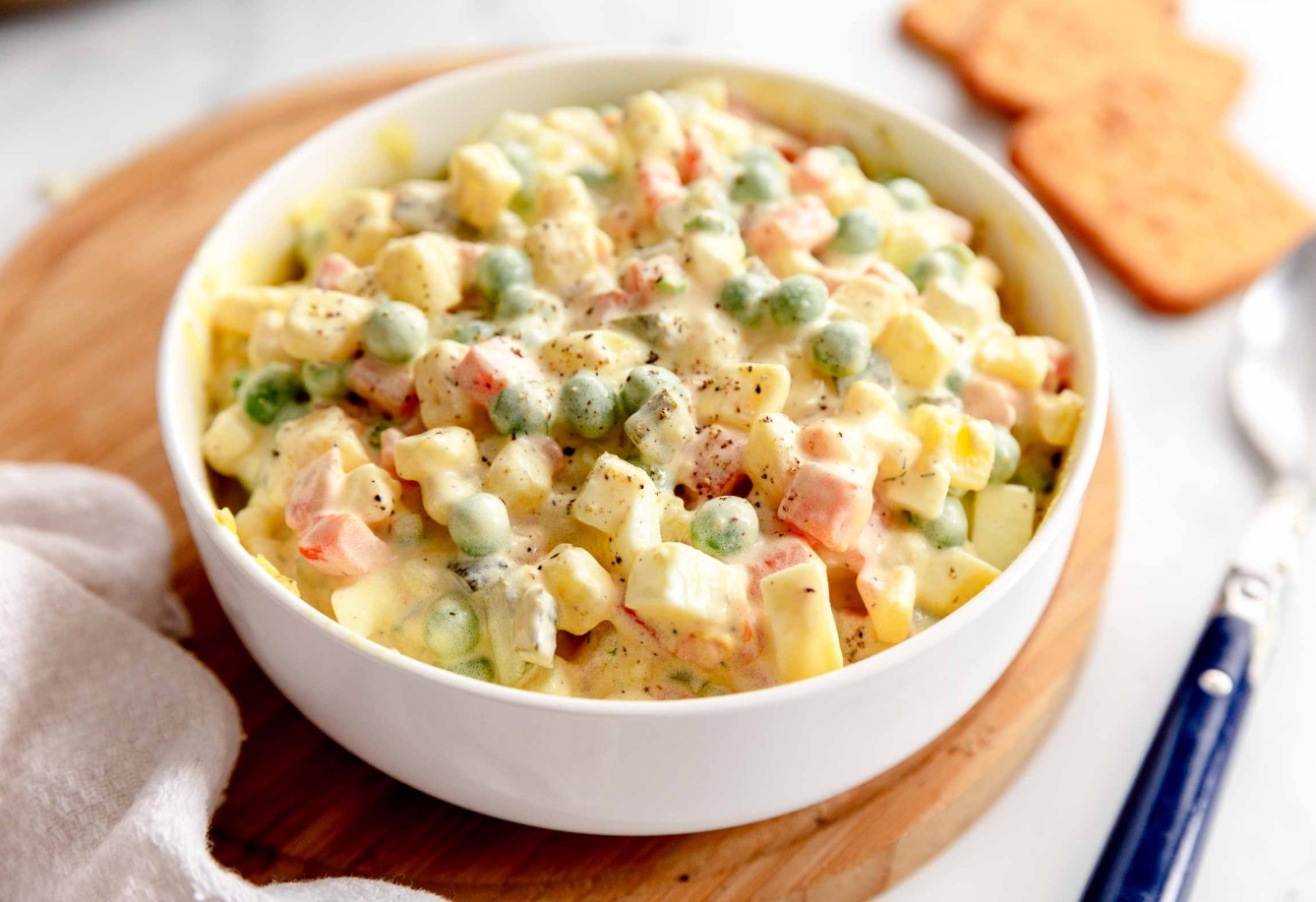 Nato kuhano jajce, zeleno, korenje, kisle kumarice in krompir narežemo na kocke v velikosti grahovega zrna.