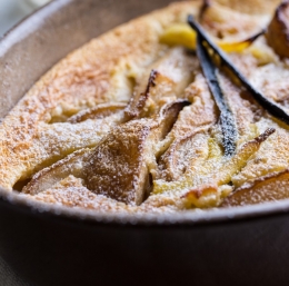 Hruške po želji olupimo, razpolovimo, odstranimo peške in narežemo na krhlje. Pekač namastimo in razporedimo hruške ter prelijemo s testom. Pečemo 30–35 minut oziroma dokler testo lepo ne naraste in se zlato zapeče. Pustimo stati 10 minut.
