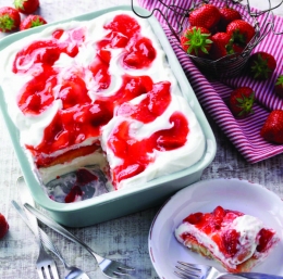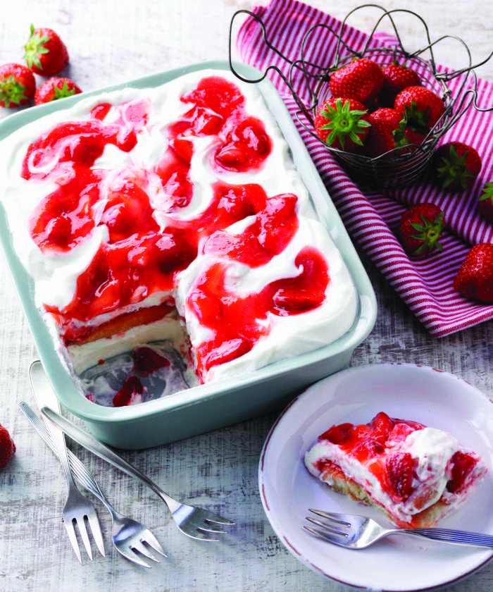Polovico smetanove kreme naložimo v manjši pekač. Piškote namočimo v liker in jih položimo na kremo. Na piškote odmerimo dve tretjini jagodne kaše in nanjo spet smetanovo kremo.