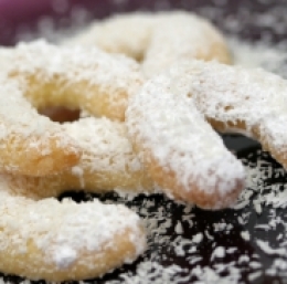 V pečici pečemo 12 minut na 170 °C. Ko so rogljički še vroči, jih posujemo z vanilijevim sladkorjem, kokosovo moko in sladkorjem v prahu.