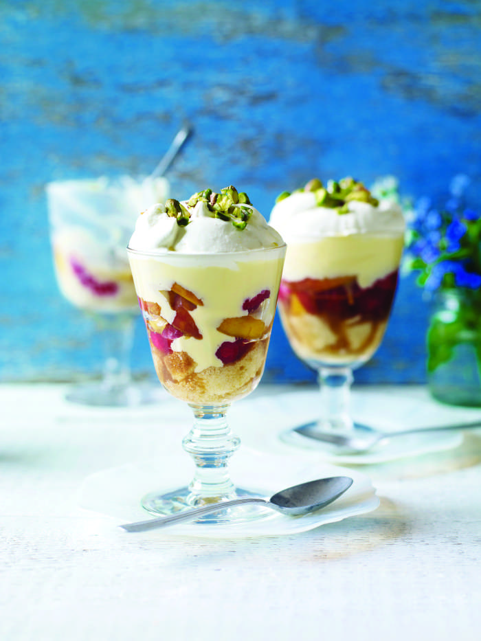 4 breskve 200 g malin 5 žlic sadnega likerja 6 rezin navadnega kolača 500 g jajčne kreme 300 ml sladke smetane 60 g slanih pistacij