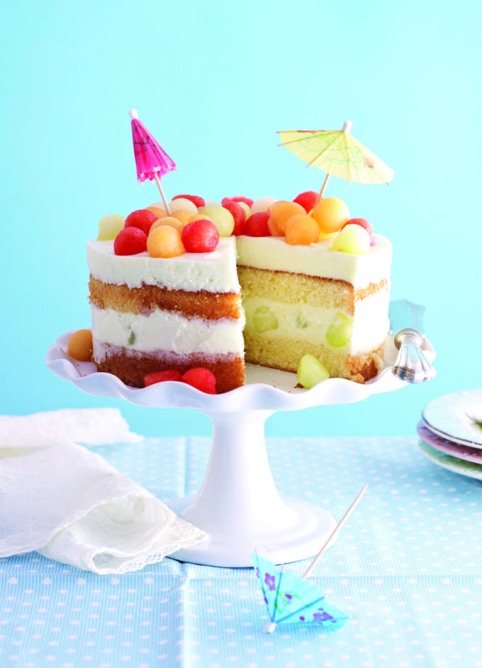 Na prvi biskvit razporedimo kroglice melone in namažemo s tretjino kreme. Pokrijemo z drugim biskvitom, obložimo s kroglicami melone in drugo tretjino kreme. Postopek še enkrat ponovimo. Na vrhu tretjega biskvita naj bo samo krema.
