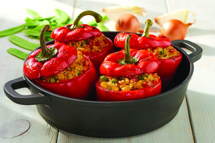 Z rižoto napolnimo paprike, jih položimo v manjši pekač in zalijemo s preostalo juho. Pečemo pol ure v pečici, ogreti na 220 stopinj.