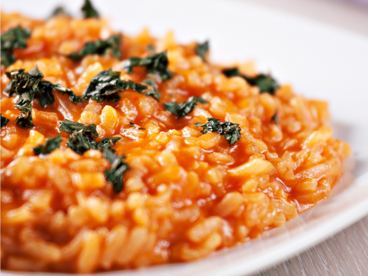 Dodamo riž, počakamo, da postekleni, nato nasekljan paradižnik. Ko izhlapi sok, po zajemalkah med prilivamo jušno osnovo, vsakič mešamo in čakamo, da tekočina izhlapi. Skuhamo klasično italijansko rižoto.
