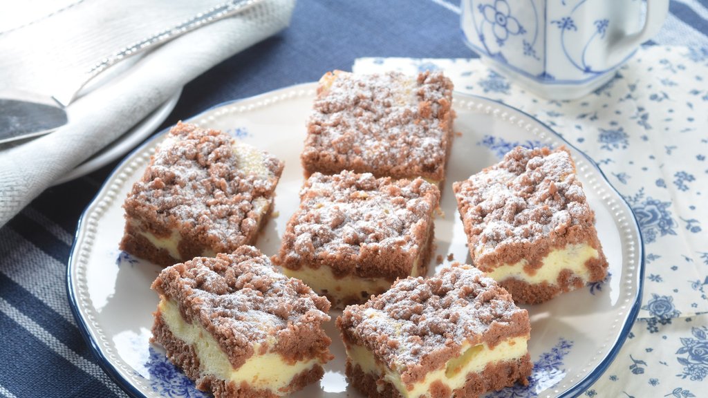 Pečico segrejemo na 180 stopinj Celzija. Globok pravokoten pekač (velikosti 25 x 35 cm) rahlo namastimo z maslom in obložimo s papirjem za peko. Po dnu pekača naribamo približno polovico testa in nanj naložimo skutin nadev, ki ga po vrhu lepo poravnamo. Po nadevu potrosimo odcejeno sadje potem pa po njem naribamo preostanek testa. Pecivo pečemo v ogreti pečici 40-50 minut. Ko je pečeno, ga ohladimo v pekaču.