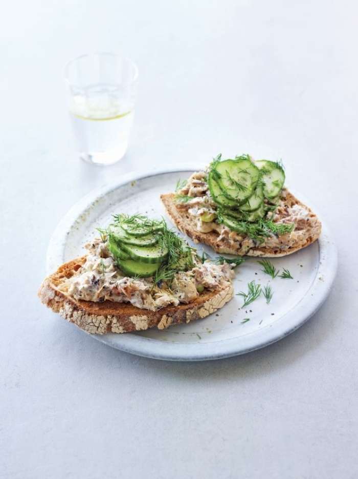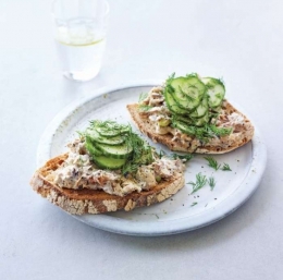 Kruh popečemo. Namažemo ga z ribjim namazom in obložimo z rezinami kumar. Potresemo s preostalim koprom in takoj postrežemo.